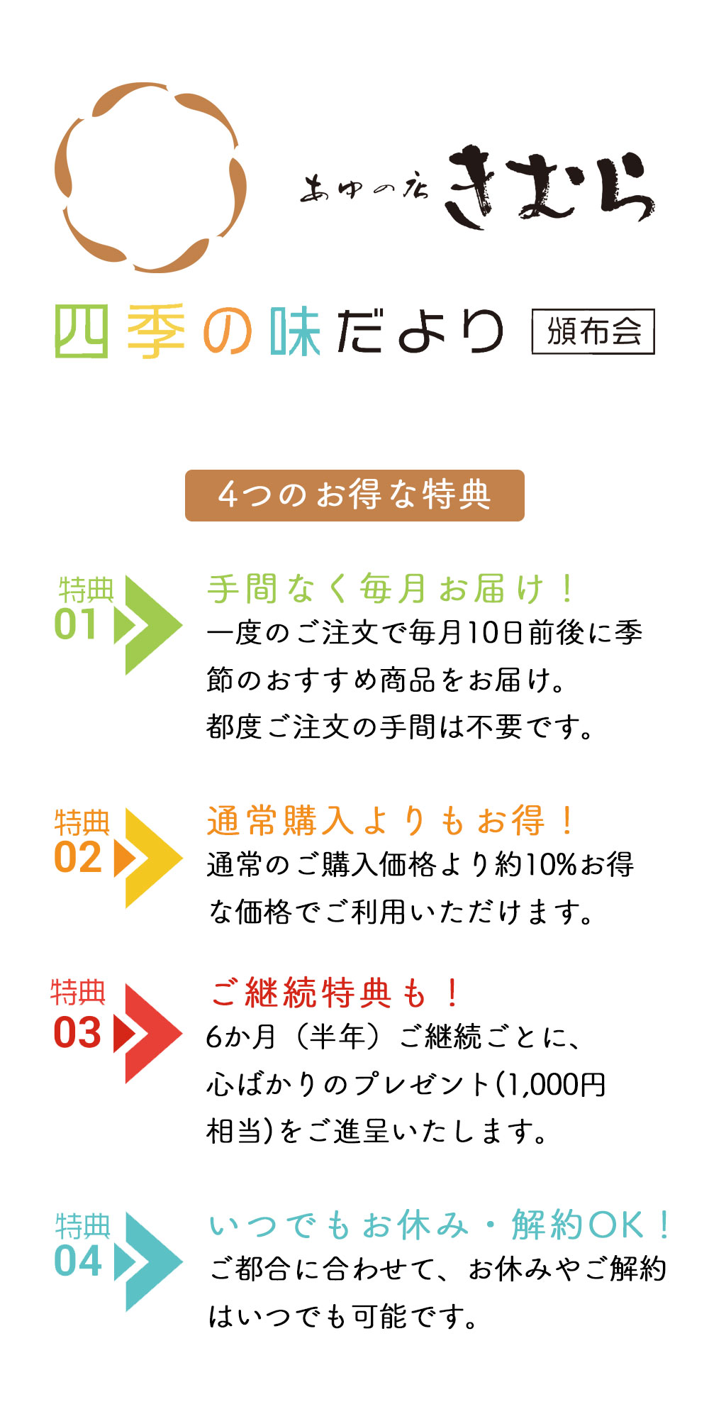 「あゆの店きむら」の季節の厳選の味わいをお届けする「四季の味だより」頒布会。