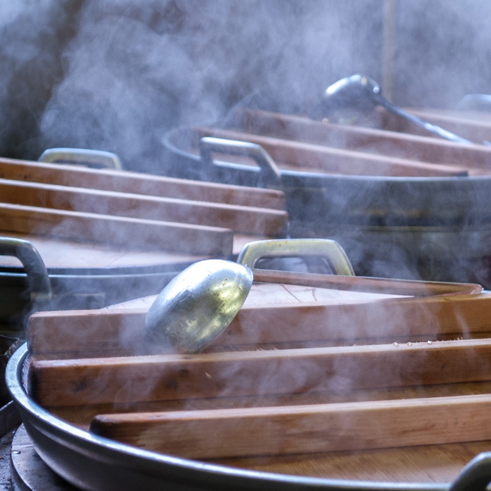 熟練の職人が小さな直火釜でじっくりと丁寧に炊き上げています。