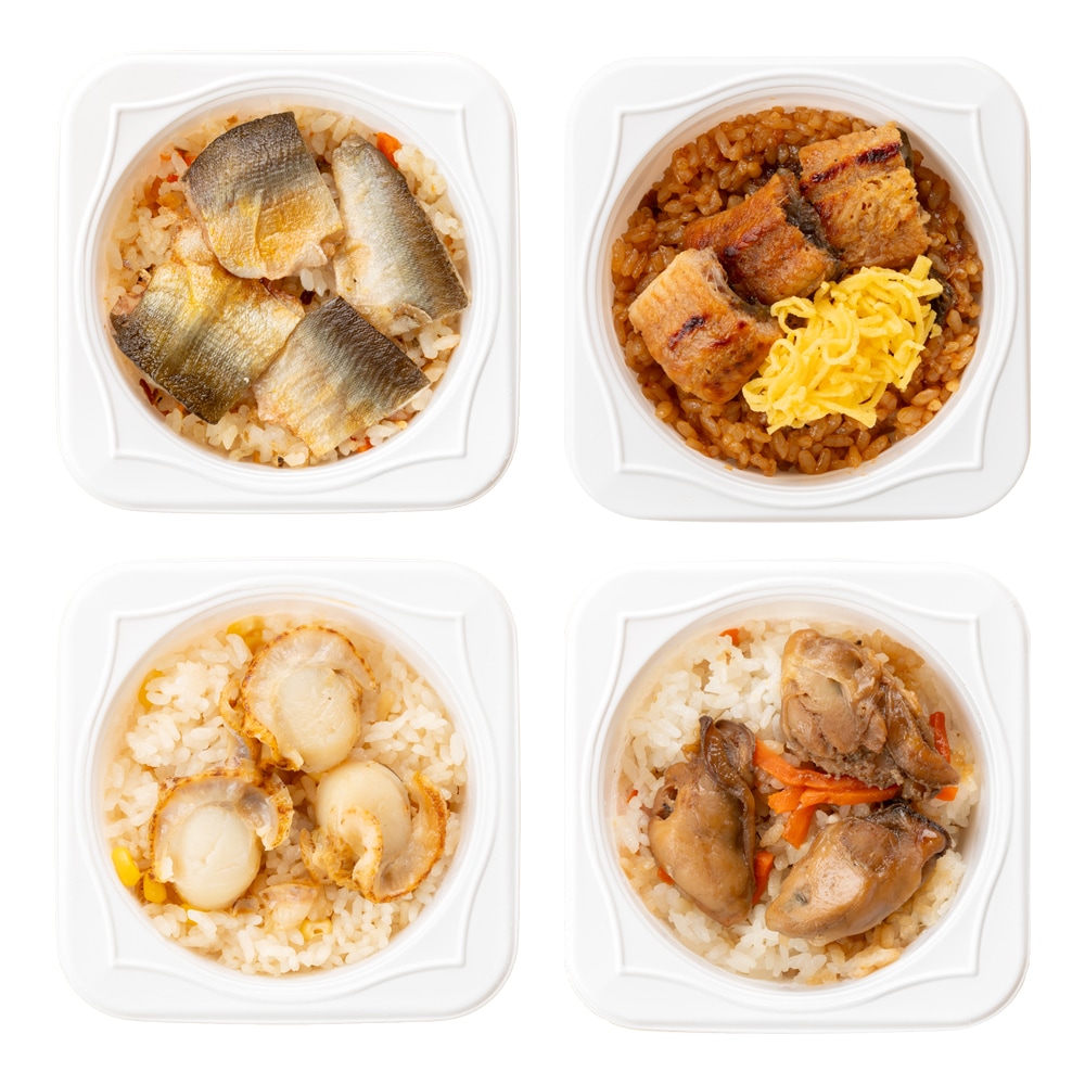 ■焼きあゆご飯:米(滋賀県産)、鮎(国産)、味つけあげ、人参、白だしの素、干し鮎、蛋白加水分解物、還元水飴、発酵調味料、食塩、昆布エキス、酵母エキス/調味料(アミノ酸等)、酒精、(一部に小麦・大豆を含む) ■鰻まぶしご飯:米(滋賀県産)、鰻(国産)、錦糸卵、醤油、味醂、砂糖、清酒/加工でん粉、pH調整剤、増粘剤(キサンタンガム)、調味料(核酸)、カロチノイド色素、(一部に卵・小麦・大豆を含む) ■帆立バターご飯:米(滋賀県産)、帆立貝(国産)、スイートコーン、バター、味醂、醤油、清酒、(一部に小麦・乳成分・大豆を含む) ■牡蠣うま煮ご飯:米(滋賀県産)、牡蠣(広島県産)、人参、白だしの素、醤油、味醂、清酒、砂糖/調味料(アミノ酸等)、酒精、(一部に小麦・大豆を含む) ■焼き鯛ご飯:米(滋賀県産)、真鯛(国産)、人参、白だしの素、生姜、醤油、味醂、清酒、乾燥三つ葉、食塩/調味料(アミノ酸等)、酒精、酸味料、(一部に小麦・大豆を含む) ■近江牛ステーキご飯:米(滋賀県産)、牛肉(滋賀県産)、ミックスベジタブル(ズッキーニ、赤パプリカ、黄パプリカ、なす)、ステーキソース、スパイスミックス/増粘剤(キサンタン)、(一部に小麦・乳成分・大豆・牛肉・鶏肉・豚肉を含む) ■近江牛すき焼きご飯:米(滋賀県産)、牛肉(滋賀県産)、乾しいたけ、ぶなしめじ、すき焼きのたれ/カラメル色素、チアミン、調味料(アミノ酸等)、香料、(一部に小麦・大豆・牛肉を含む) ■銀だら西京焼きご飯:米(滋賀県産)、銀だら西京漬(国内製造)、味つけあげ、人参、白だしの素、ゆず皮/調味料(アミノ酸等)、酒精、(一部に小麦・大豆を含む)