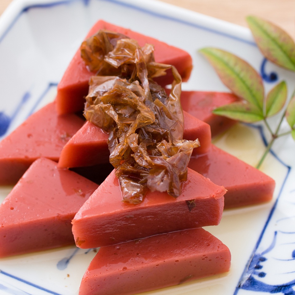 近江湖東で昔から食されている赤こんにゃくを、鰹節と一緒に炊き込んだ食卓を彩る一品。